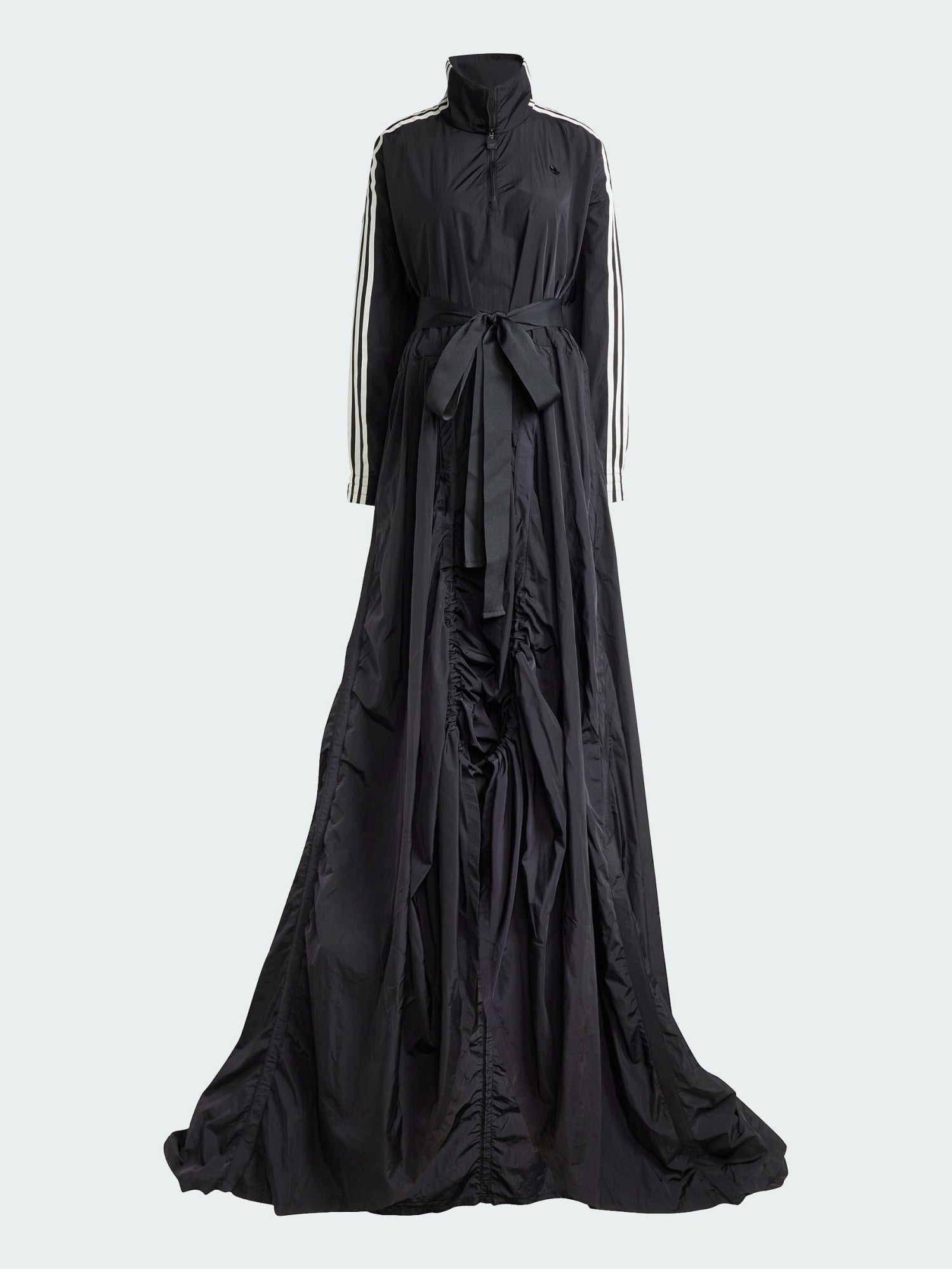 Rooted in authentic sportswear, this maxi dress taps into the ultra-elegant side of fashion. Part track top, part voluminous dress, ruching detail and an extra-long reach create a draped look that's both dazzlingly old world and daringly new. It has a loose, easygoing fit with a stand-up collar. A long belt wraps around the waist and dangles in the front.