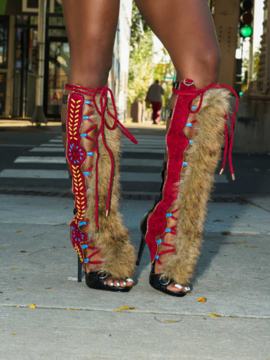 - Over-the-knee boots featuring vibrant red panels with intricate multicolor embroidery and decorative cutouts.