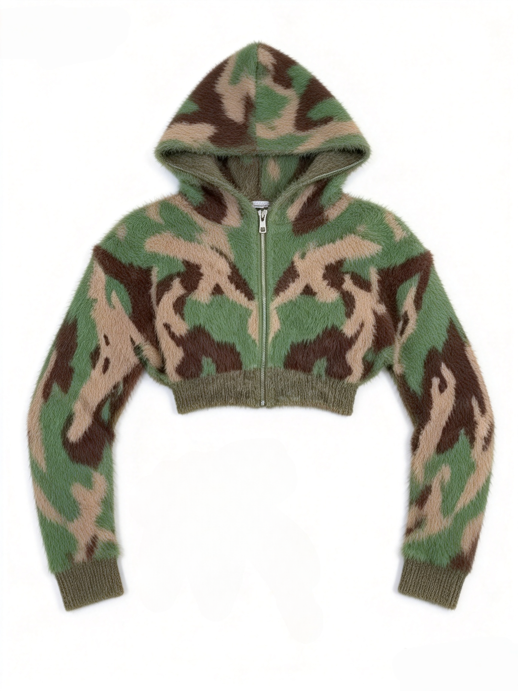 A bold two-piece coordinates set featuring a cropped, hooded cardigan with a camo knit pattern and matching oversized shorts. The look is completed with tall boots for a chic, street-style vibe. Soft, cozy fabric offers comfort while the silhouette creates a daring, fashion-forward statement perfect for casual outings or themed events.