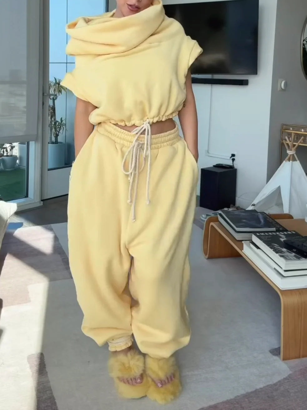 Ultra high cowl, cropped "hoodie" vest.