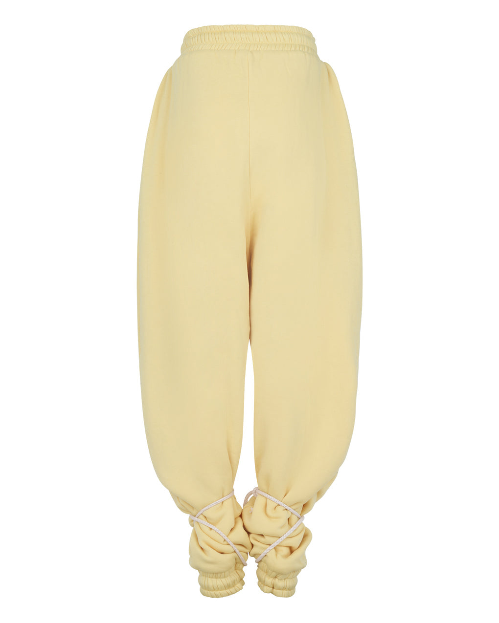 Elasticized, drawstring waistband and ankle cuffs. Cotton drawstrings at ankles and waist.
