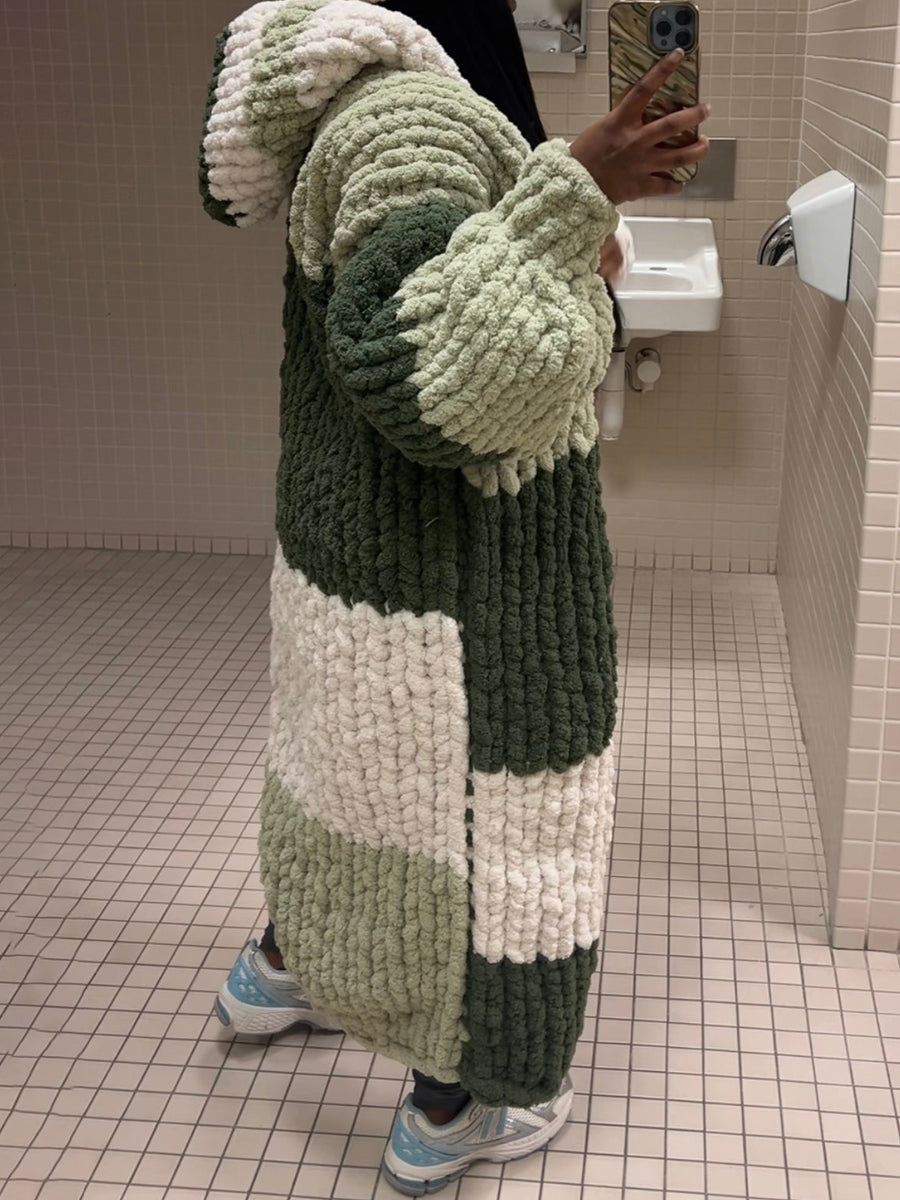 - Cozy oversized knitted coat with color-block panels in deep forest green, soft cream, and ivory.