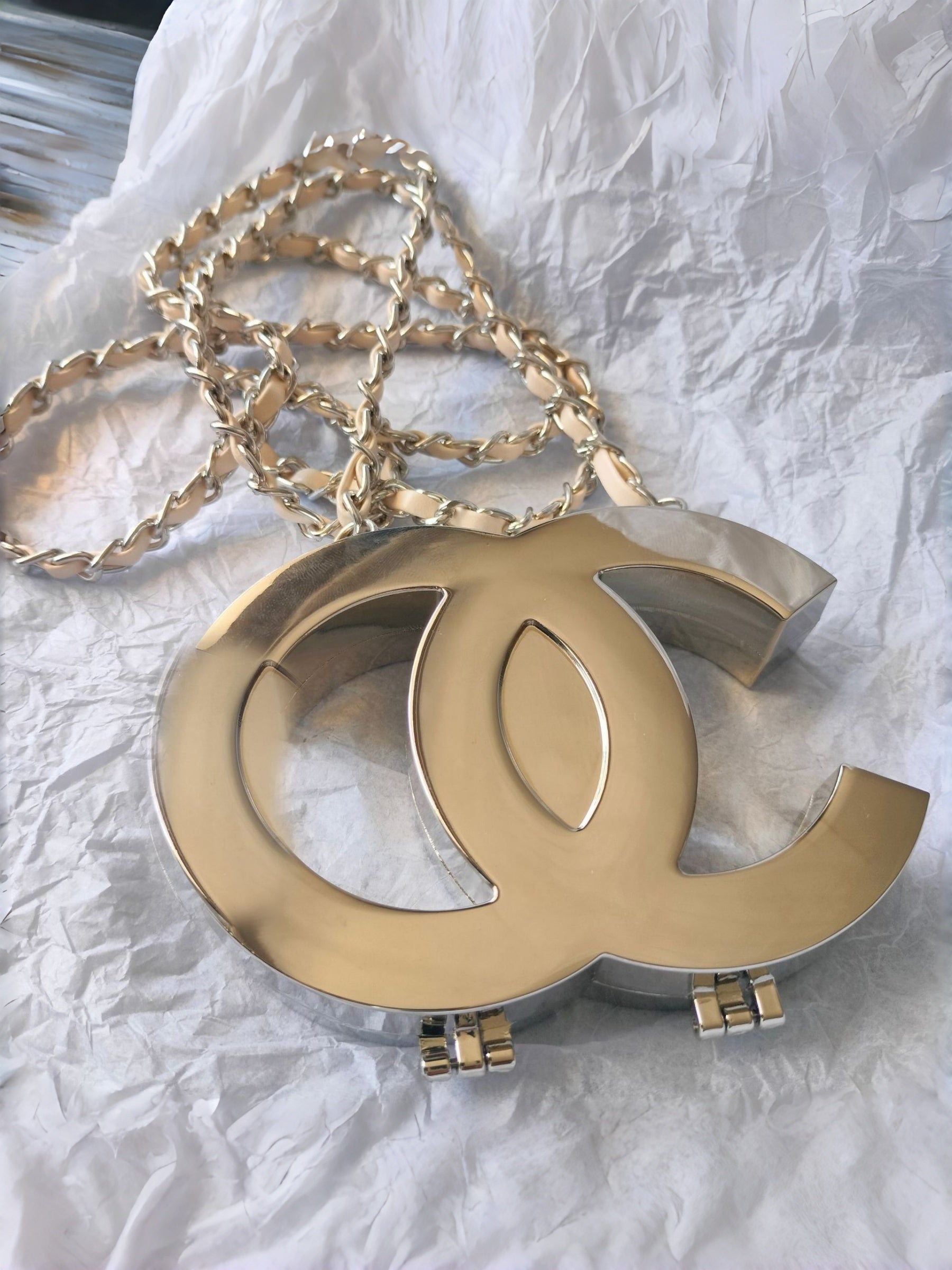Interlocking double-C pendant in polished metallic finish. A statement piece that exudes timeless luxury, crafted with a sturdy chain and secure clasp for comfortable wear. Perfect for elevating evening outfits or adding a chic touch to everyday looks.