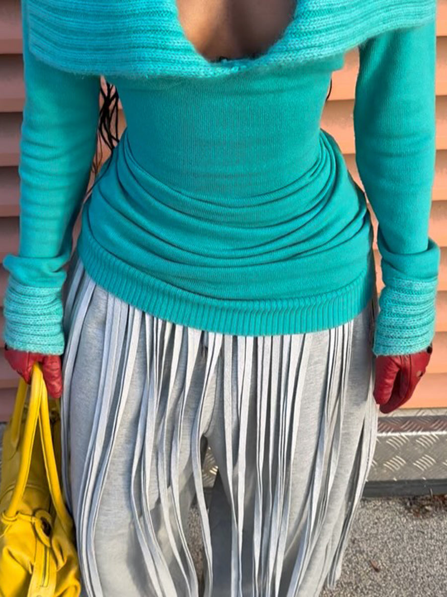 The turquoise knit sweater featuring a dramatic, wide-draped collar that creates a striking, sculptural silhouette. Long sleeves with subtle ribbing and a fitted waistcoat-length bodice for a sleek, hourglass look. Ideal for making a fashion-forward statement in cool weather when paired with a midi skirt, tailored pants, or layered over a statement dress.