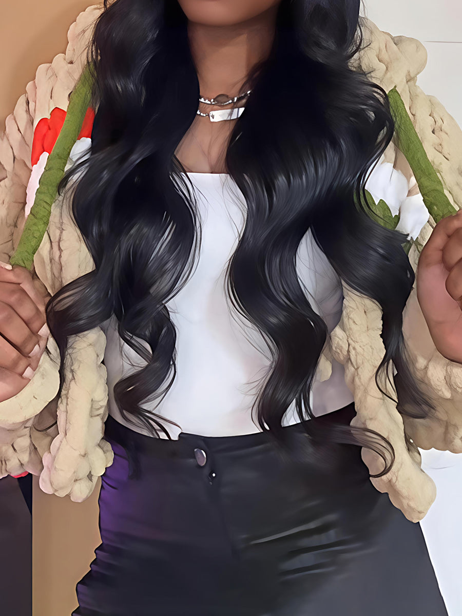 - Plush, boucle knit creates a bold, cozy statement piece.