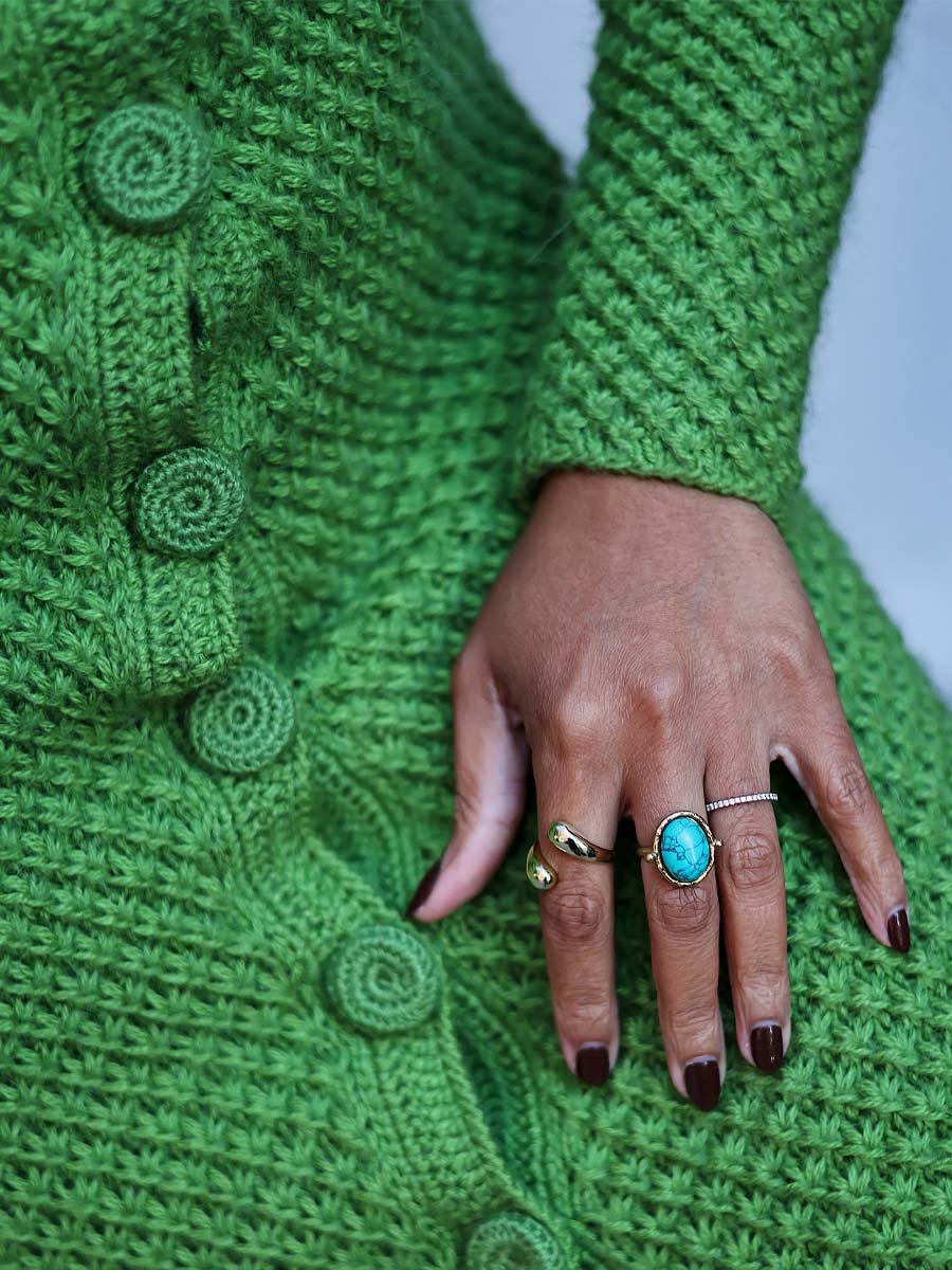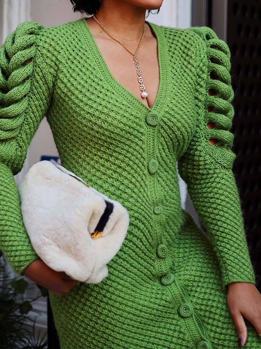 The Statement Sleeves Dress is a bold and sophisticated piece that showcases unique, sculptural sleeves and a form-fitting silhouette. The deep V-neckline and button-down front add a touch of elegance, while the dramatic braided sleeves create a striking visual impact. The dress is finished with a playful fringe hem, adding texture and movement to the design. Perfect for making a statement at any event, this dress blends modern design with timeless charm.