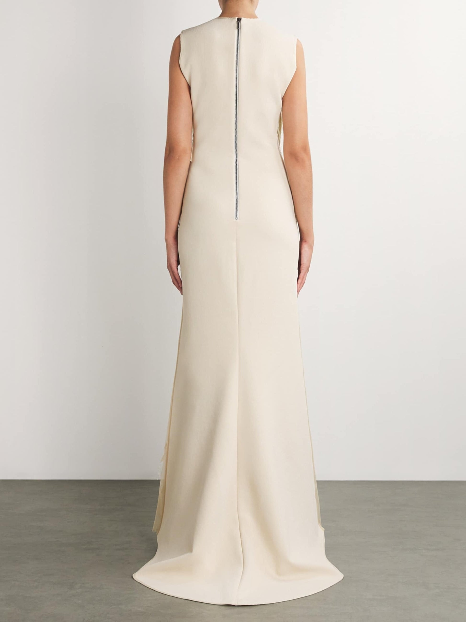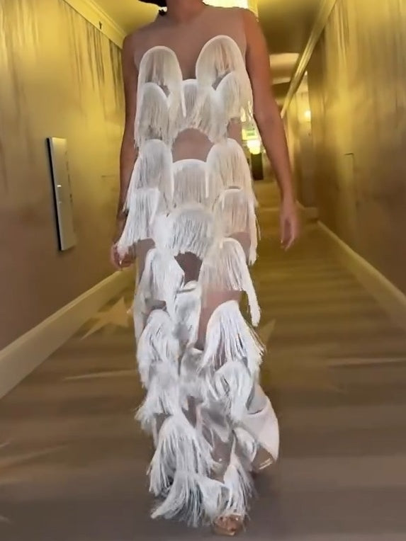 The Fringe Gown is a stunning example of the brand's artistry. This gown features a panel of delicate, sheer mesh with bold fringing in a scalloped pattern. The fringing cascades down the front of the gown, creating a floating effect. The gown is sleeveless and has a round neck. The gown is made of a lightweight fabric and features a back zipper closure.