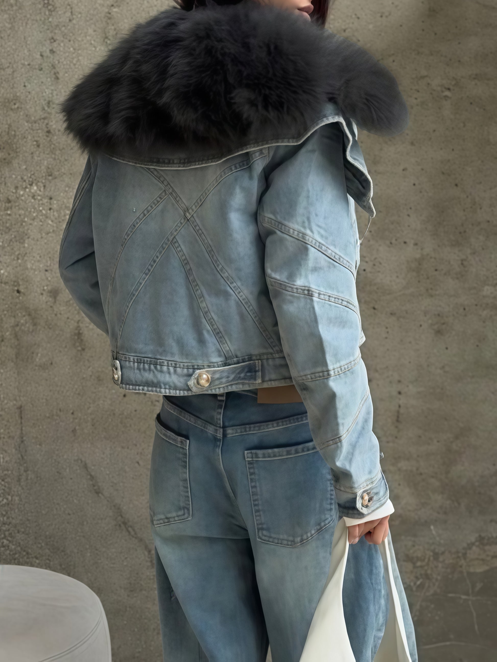 - Modern denim jacket with an oversized silhouette and dramatic dark fur collar for a luxe, street-ready look.