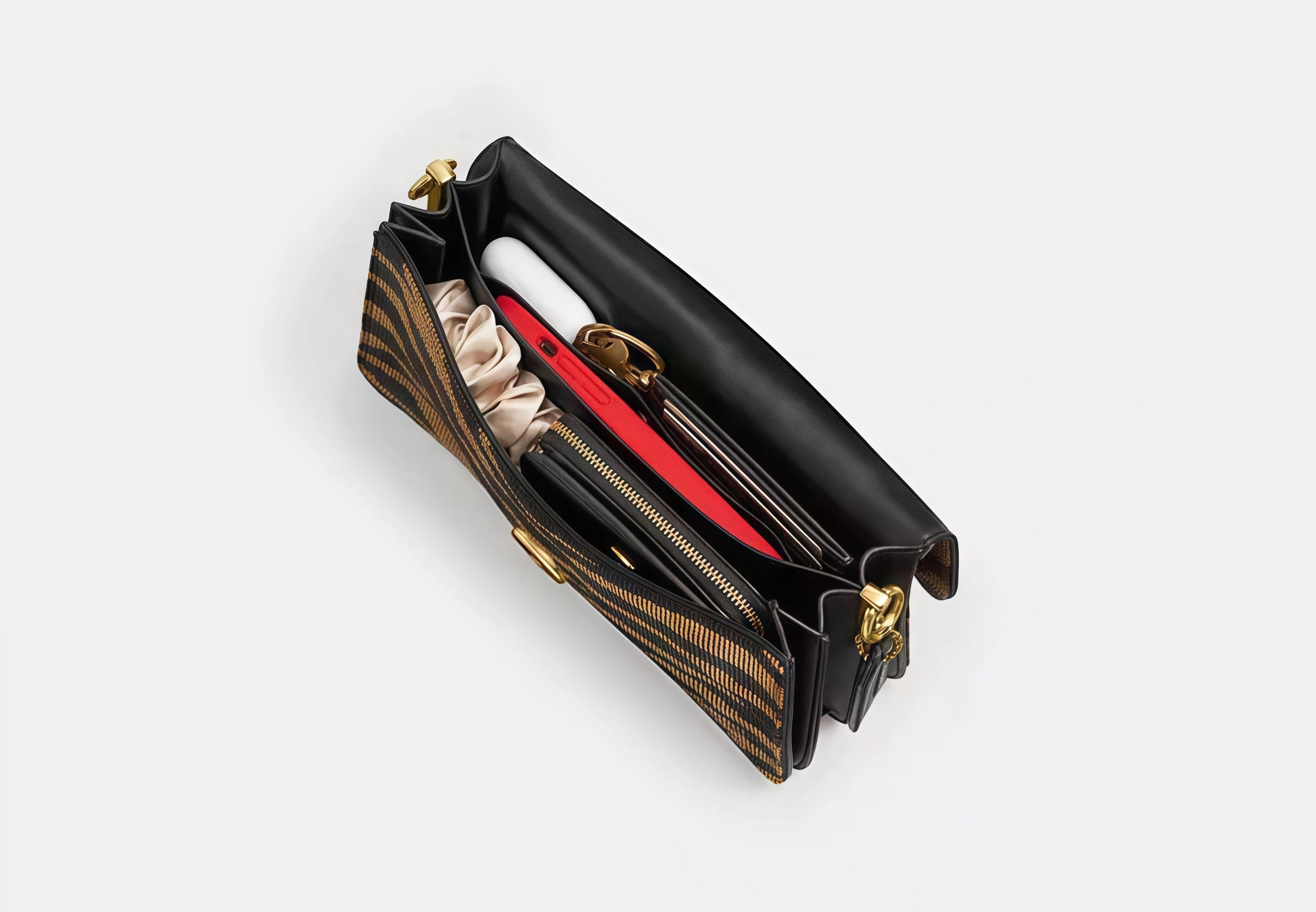 A chic, compact shoulder bag featuring a bold tiger-stripe motif in warm hues. Crafted with a glossy finish and a leather-like feel, it’s accented by a chunky gold-tone chain strap and a distinctive logo hardware. This statement bag adds instant glam to evening looks or brightens up daytime ensembles. Includes a secure flap closure and ample interior for essentials.