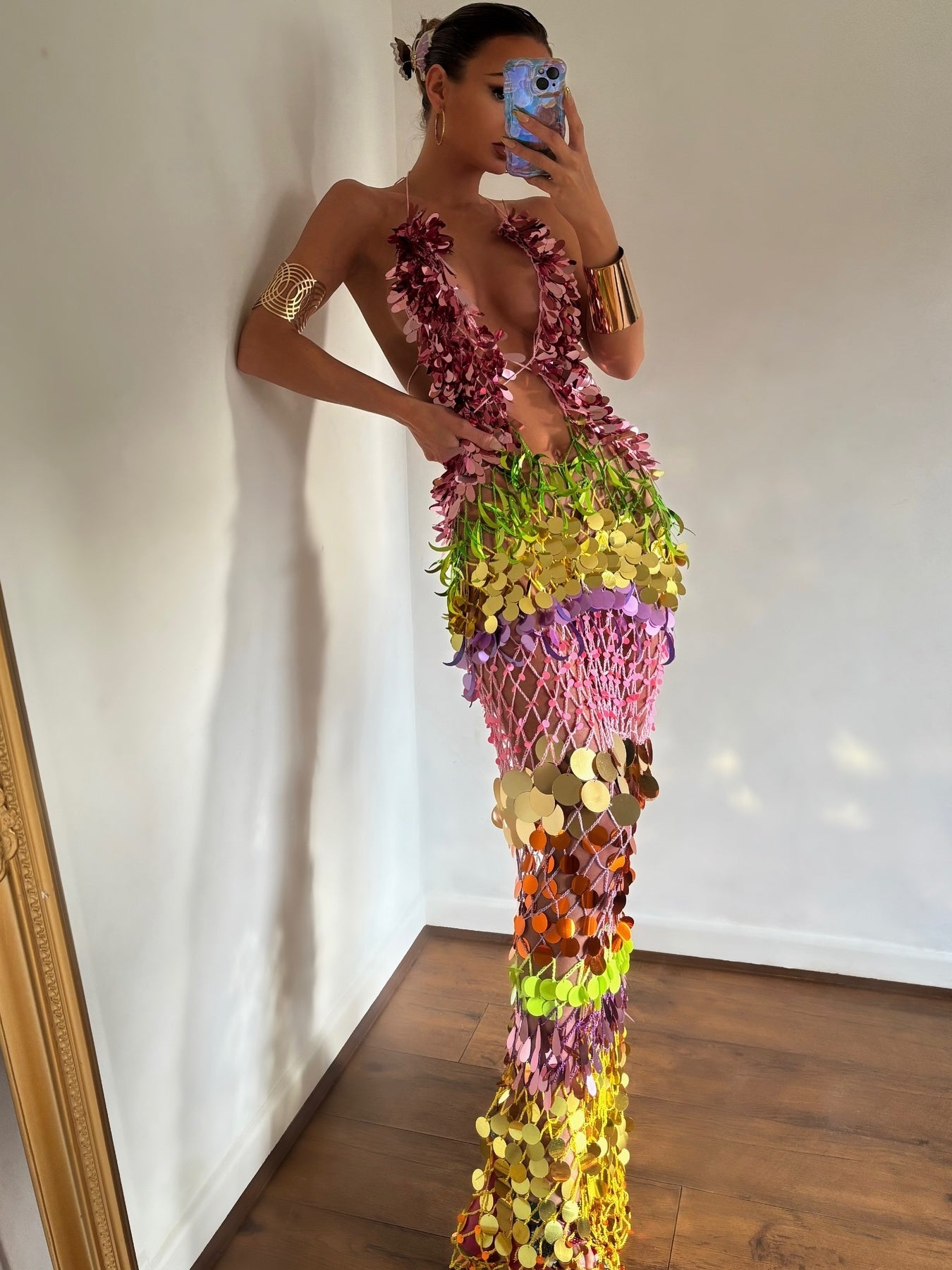 - Vibrant, multicolor sequin dress arranged in a gradient from pink/purple to orange/yellow/green