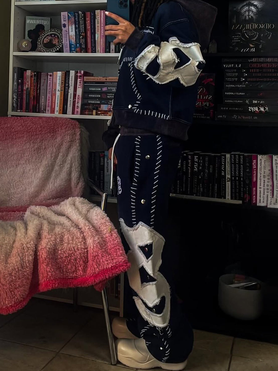 - streetwear suit set featuring a oversized zip hoodie and matching relaxed-fit pants.