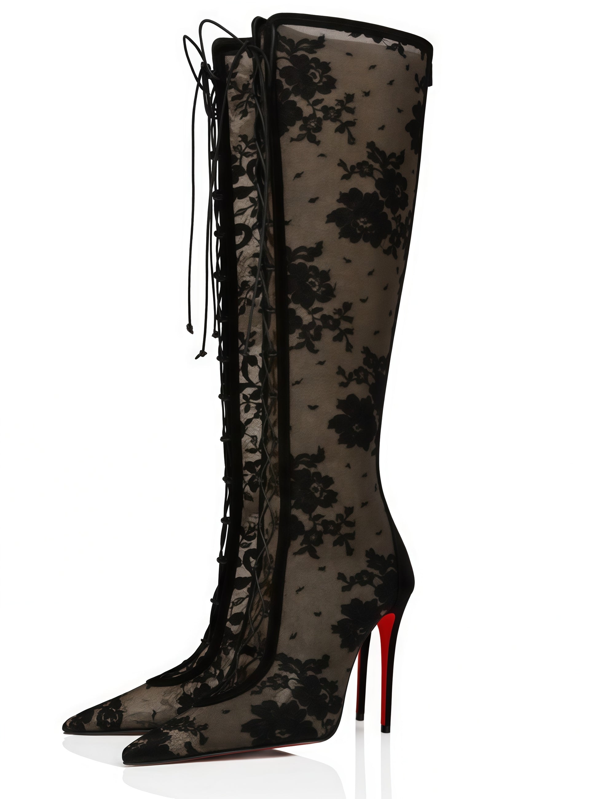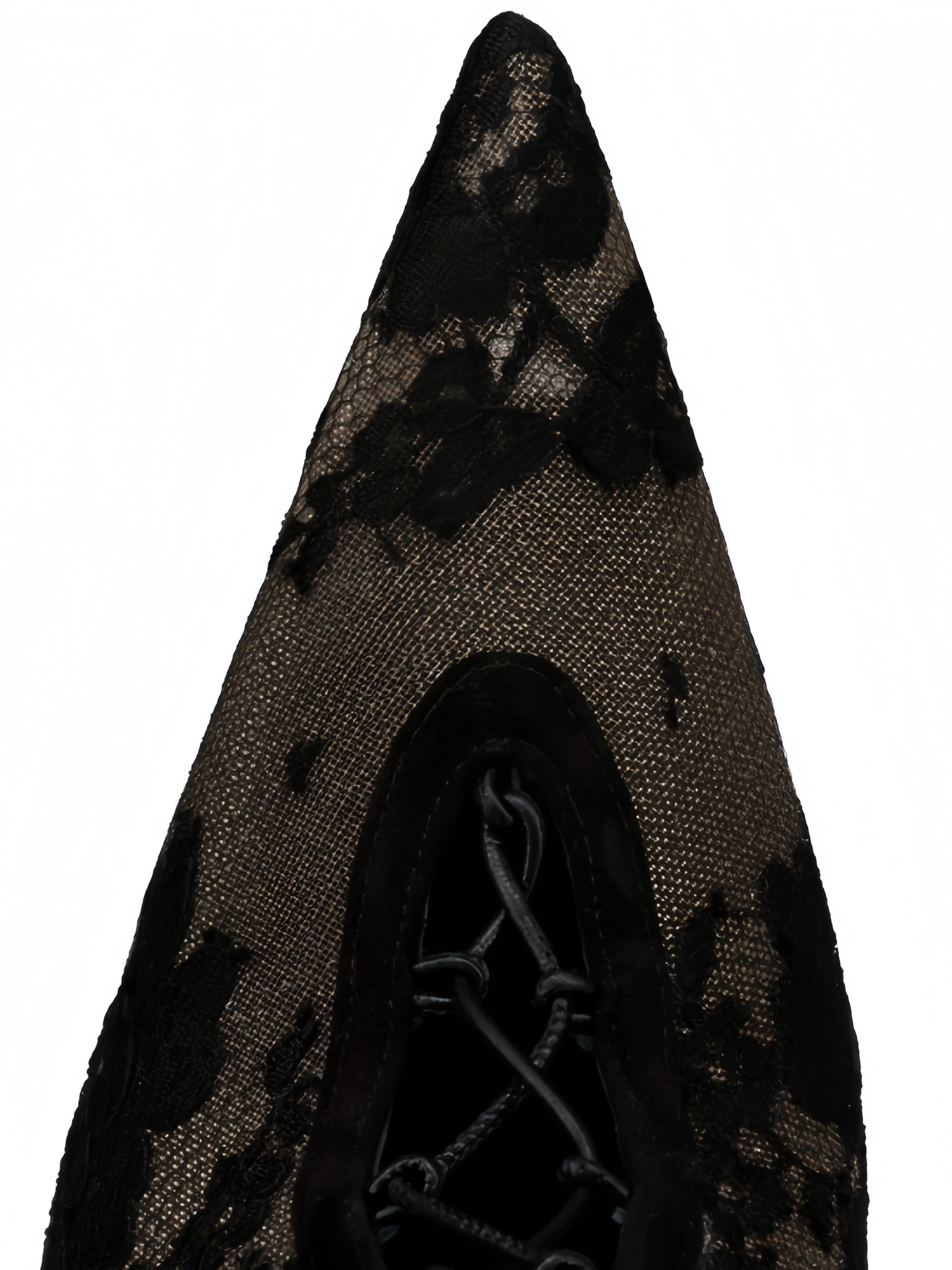 The boot features elegant lines. It has a very pointed toe and discreet lacing at the front that reveals the foot and leg with sophistication. Blending floral lace with suede calfskin and kid leather, this black shoe is set on a 100 mm stiletto heel and features a padded insole.