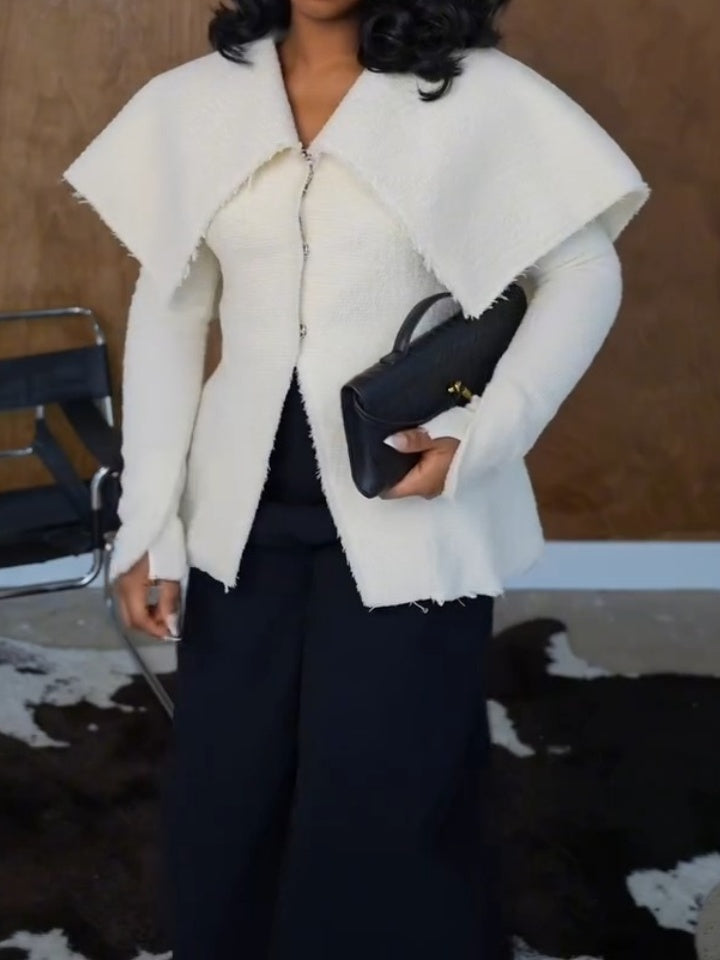 A sculptural white boucle jacket with oversized cape-like shoulders and raw-edged hems. Crafted for an architectural silhouette, it features clean lines and a structured fit that layers beautifully over sleek tops or dresses, creating a modern, editorial look.
