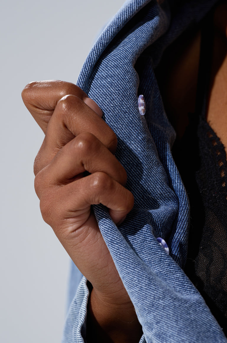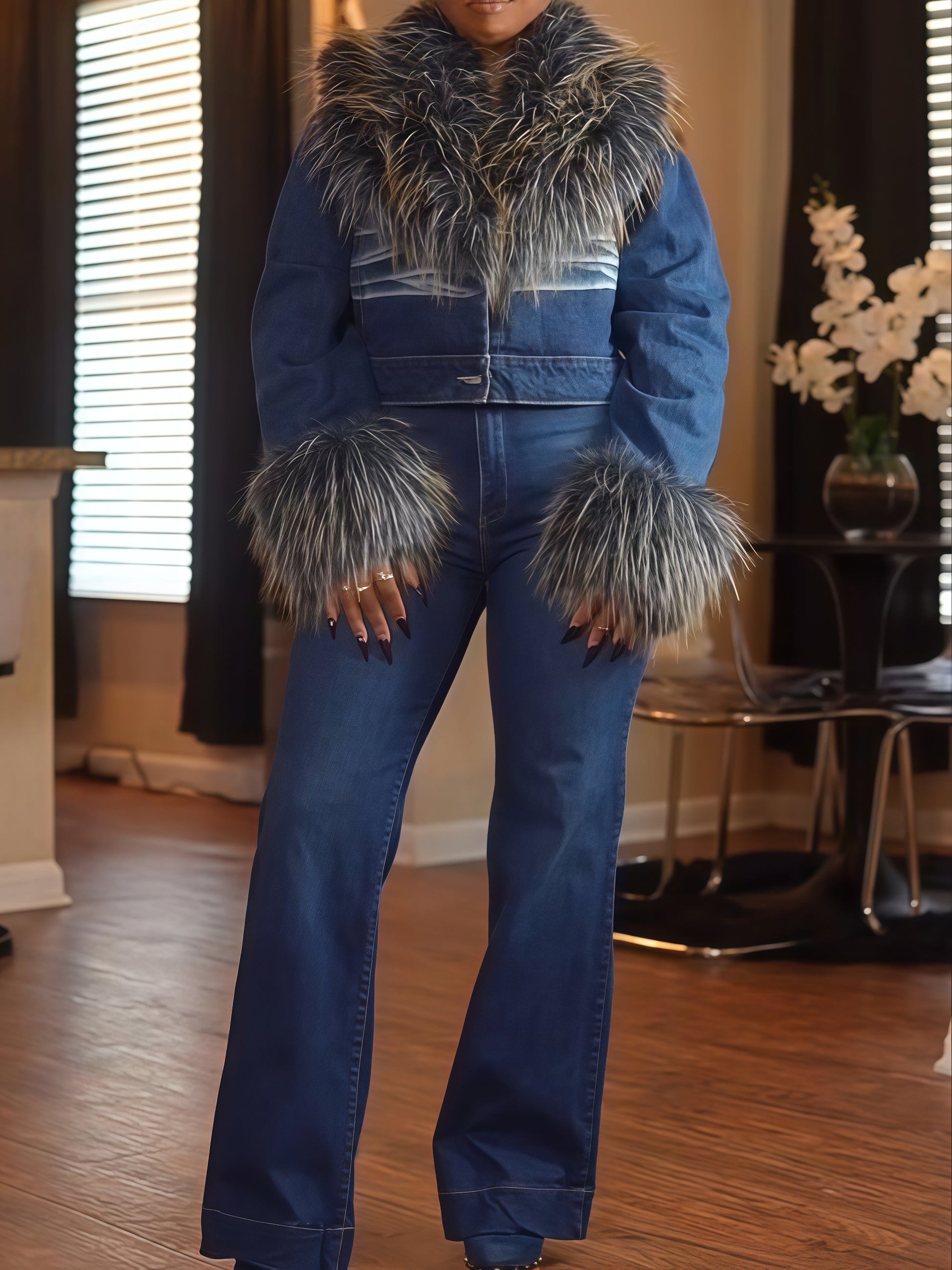 - The New Gisele Cropped Fur Trim Jacket is a high glam, Y2K revival style crafted from soft, light wash denim. It features an ultra-cropped silhouette, a wide fold-over collar with a detachable faux fur overlay, long sleeves with coordinating faux fur cuffs, a single-button front closure, and a slick inner lining. Style it with oversized hoop earrings and a low-rise mini skirt for a nostalgic and sexy finish.