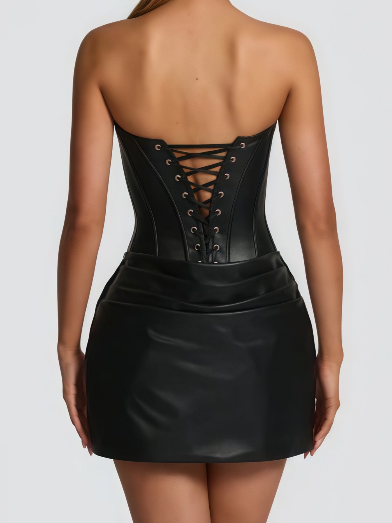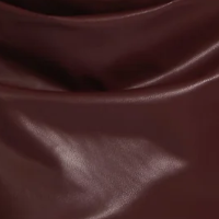The Mini Dress in rich burgundy features a soft faux leather fabric with a scooped neckline and pleated cowl. Its structured bodice with boning and dropped waist enhance a refined silhouette, while the cowled overlay skirt with deep side pleats adds graceful movement.