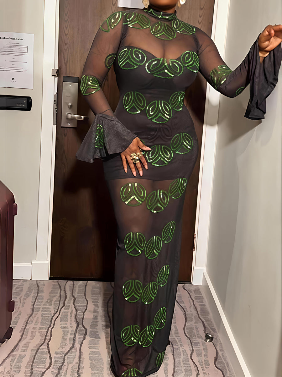 - Sheer black maxi dress with vibrant green circular motif embroidery.