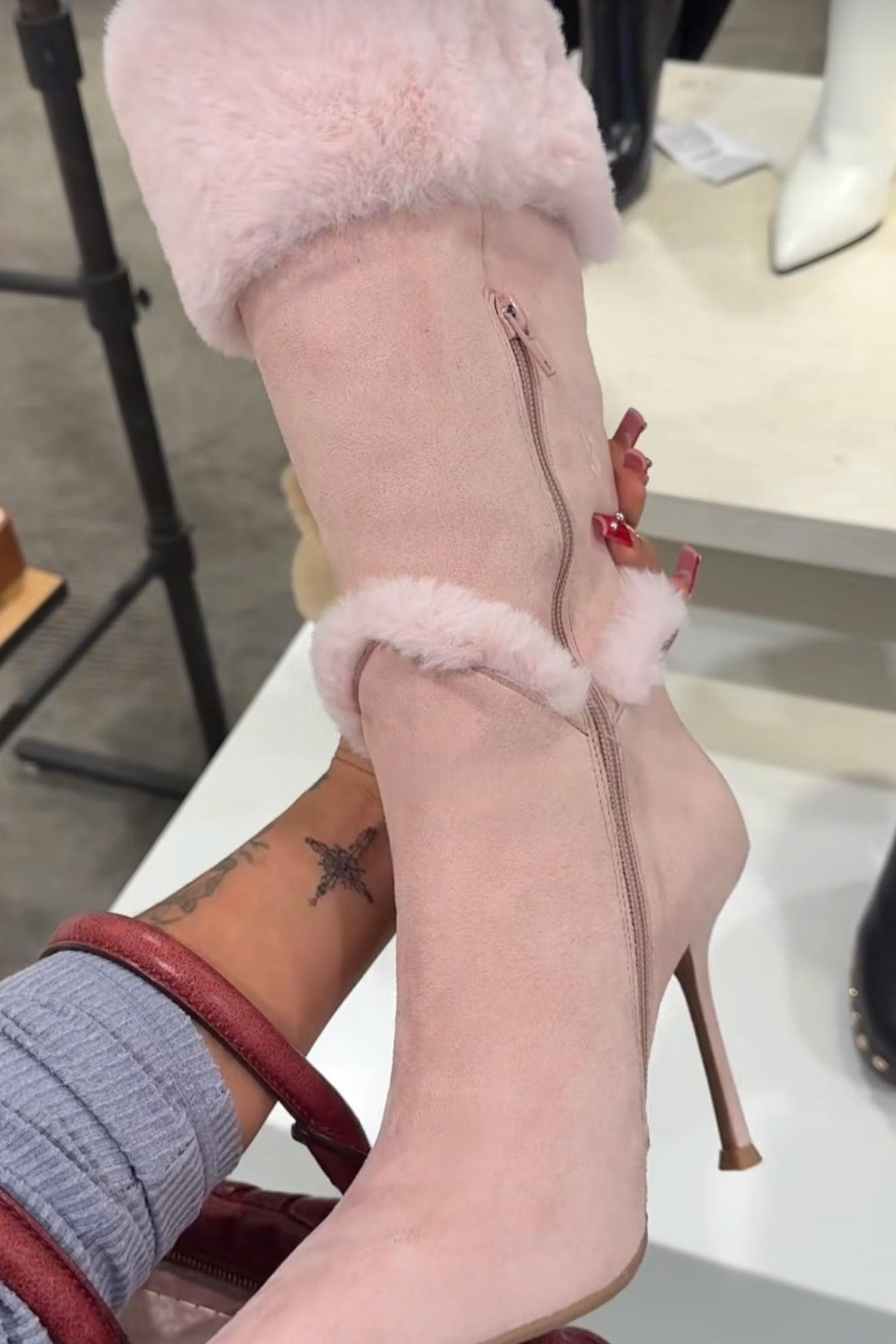 - Chic knee-high boots in soft blush suede with plush faux-fur trim for a luxurious, wintry look.